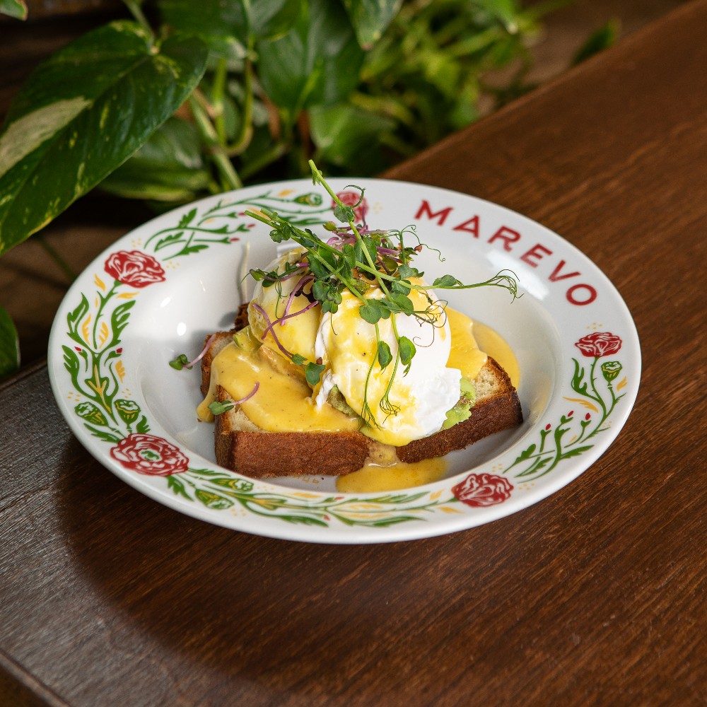 Яйця з голландським соусом, авокадо на нашому бріоші. Обирайте додатки на свій смак.